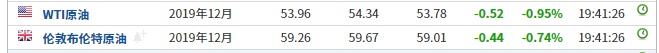 美国API数据显示,美国上周原油库存增加445万桶至4.370亿桶,增幅超过预期,国际油价下跌。截止发稿,WTI原油跌0.95%,报53.96美元/桶。布伦特原油跌0.74%,报59.26美元/桶。