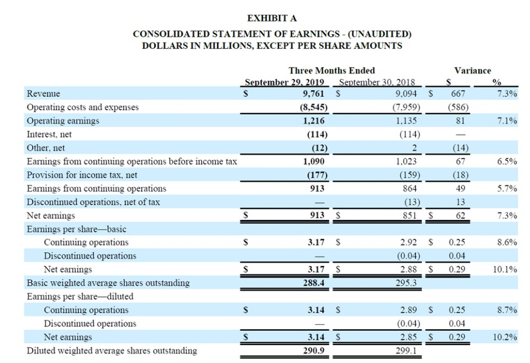 财报显示,三季度收入为98亿美元,营业收入为12亿美元,同比增长7.1%。持续经营业务收入为9.13亿美元,同比增长5.7%。第三季度净收益9.13亿美元,摊薄后每股收益为3.14美元,同比增长10.2%。