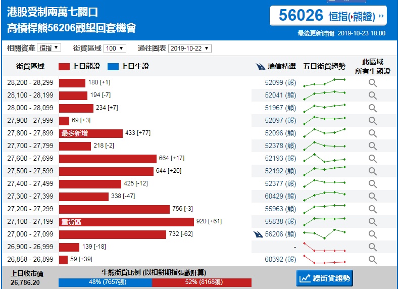 智通财经APP获悉,截至10月23日,恒指最新的牛熊街货比例48:52。瑞信恒指牛熊证街货分布图中的数据显示,熊证街货重货区在27100-27199区间,该区间最新熊证数量为920张,较上一交易日增加61张,最多新增在27800-27899区间,较上一交易日增加77张。牛证街货重货区在25200-25299区间,该区间最新牛证数量为696张,比上一交易日增加35张;最多新增在26400-26499区间,较上一交易日增加269张。