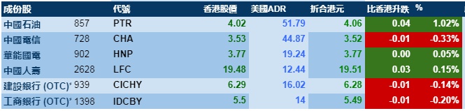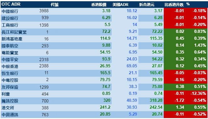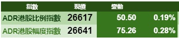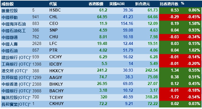 智通财经APP获悉,周三(10月23日)美股反覆靠稳,三大指数小幅收涨。港股ADR指数全日表现向好,按比例计算,收报26617点,升50.50点或0.19%。大型蓝筹涨跌不一,汇丰控股收报61.73元,较港收市涨0.53元;腾讯控股收报318.28元,较港收市跌1.72元。