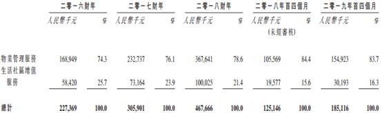 公司的主要收益来自物业管理服务,2016年—2018年及2019年首四个月,该项业务收益分别占公司总收益的74.3%、76.1%、78.6%和83.7%。
