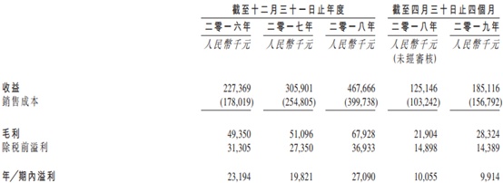 据招股书,2016年—2018年,公司的总收益分别为人民币227.4百万元、人民币305.9百万元及人民币467.7百万元,复合年增长率为43.4%,而公司于该等年度的纯利分别为人民币23.2百万元、人民币19.8百万元及人民币27.1百万元,复合年增长率为8.1%。
