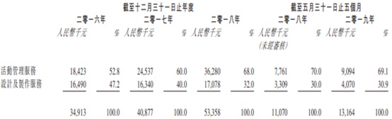 2016年—2018年及截至2019年5月31日止五个月,公司的收入的52.8%、60.0%、68.0%及69.1%来自公司的活动管理服务,而于同期收入的47.2%、40.0%、32.0%及30.9%来自公司的设计及制作服务。