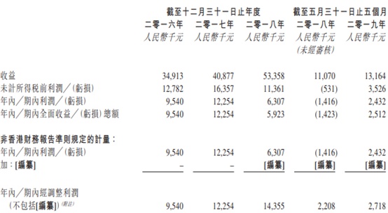 2016年—2018年及截至2019年5月31日止五个月,公司的收益分别约为人民币3491.3万元、人民币4087.7万元、人民币5335.8万元及人民币1316.4万元;利润分别约为人民币954万元、人民币1225.4万元、人民币630.7万元及人民币243.2万元。
