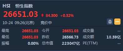智通财经APP获悉,恒生指数开盘高开84.3点或0.32%,报26651.03点。国企指数涨0.25%,报10477.4点。红筹指数涨0.52%,报4263.11点。大市盘前成交18.59亿港元。隔夜美股小幅收涨,道指涨超45点。NYMEX期油收涨2.57%报55.88美元/桶。