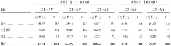 园林业务为公司的主要收益来源。于2016财年—2018财年及截至2018年及2019年6月30日止六个月,来自园林分部的收益分别占公司总收益的约78.7%、49.7%、57.4%、54.6%及52.4%。自2016财年以来,公司加大了对生态修复分部的开发力度,于相同期间,该分部分别贡献公司总收益的约17.0%、45.4%、35.4%、42.1%及37.3%。