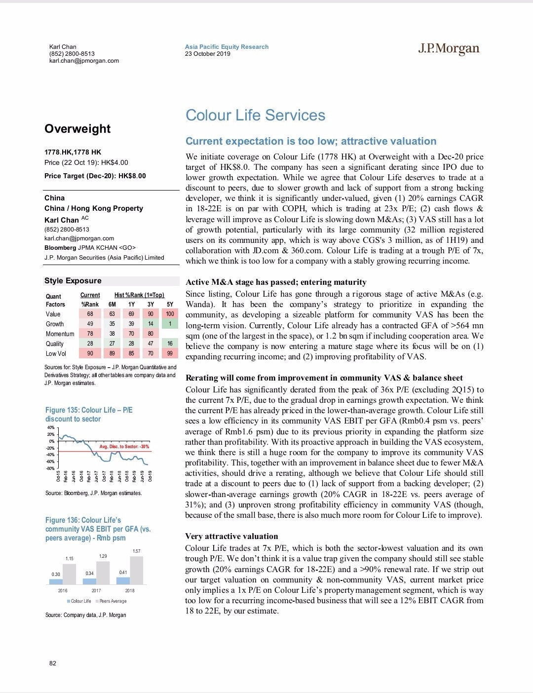 因为彩生活三类业务属性不同,基于分类估值的方法,我们给予彩生活未来一年的目标价为8.0港元。我们的目标价格,对应2020年净利润预期的14倍PE。