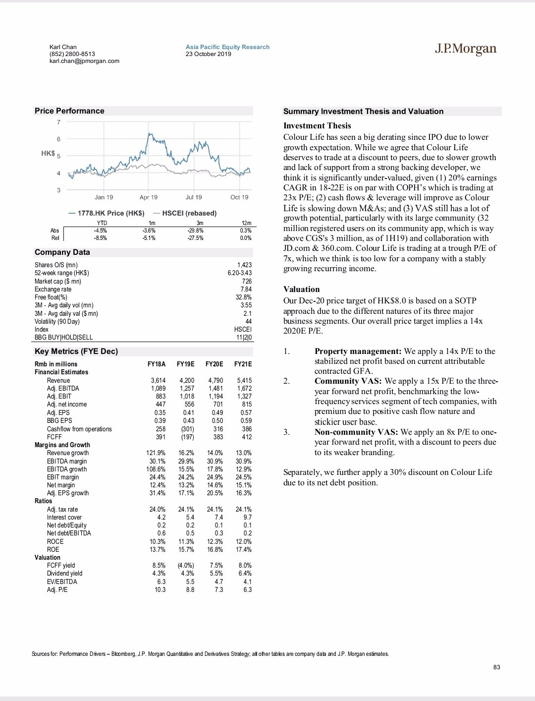 此外,因为收并购活动的减少,彩生活的资产负债表也将被改善,上述因素将共同驱动彩生活的重新估值,即使我们认为相比于其他同类型企业来讲彩生活会有估值折价,主要原因是:1)缺乏房地产开发商的支持;2)低于行业平均水平的增长速度(18-22年的年复合增长率20%,行业平均为31%);3)社区增值业务的强劲盈利效率尚有待被证实(即使目前基数较小,彩生活具有很大的改善空间)。