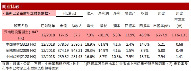 经营业绩方面:2016至2018财年及2019年截至4月30日,公司实现营业收入分别为24亿元、31.1亿元、33.6亿元及9.4亿元,19年前4个月同比减少主因预拌混凝土销售所产生的收益减少;毛利率方面分别为16.4%、13.0%、10.7%及9.1%,持续下跌主要由于原材料成本价格一直上涨所致;净利率方面分别为8.1%、7.0%、5.3%及3.8%;贸易应收款项分别为15.6亿元、20.1亿元、25.6亿元及25.2亿元,周转天数分别为193天、208天、246天及318天,主要由于银行收紧针对政府资助项目的信用政策导致结算流程延长,未来若客户规模增大,公司开单及结算过程滞后,将会对公司现金流产生不利影响;公司绝大部分收入来源于云南建投集团,分别占比约为81.4%、84.1%、73.3%及61.5%。2019年上半年参与招投标项目已经超过2018年全年,截止2019年上半年,公司预拌混凝土销售新签合同价值总额已达13.36亿元。