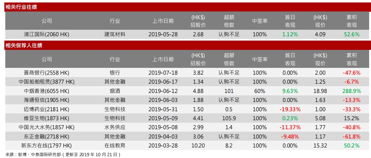 估值方面:按全球公开发售后的4.5亿股本计算,公司市值为12.3-15.7亿港元,相比港股同行较低。18年公司市盈率约为6.2-7.9倍,处于建材行业平均水平;市净率约为1.16-1.35倍,高于行业平均。盈利能力方面,18年的ROE、ROA分别为45.9%和13.9%,高于行业平均。我们考虑到公司业绩表现下跌比较严重,以及基石方面引入两家国企背景的投资者中联重科(01157)和华润水泥(01313),合计认购发售后H股约40%股份导致流通性较低。综合公司的行业地位、业绩情况与估值水平,我们给予其55分,评级为“不申购”。