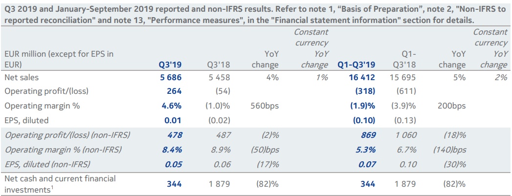 财报显示,诺基亚三季度净销售收入为56.86亿欧元,同比增长4%,基于固定汇率的情况下同比增长1%。营业利润为2.64亿欧元,去年同期为亏损5400万欧元。利润率为4.6%,同比增长560个基点。摊薄后每股收益为0.01欧元,去年同期为负0.02欧元。第三季度归属于母公司股东的净亏损为200万欧元,去年同期为亏损7900万欧元。