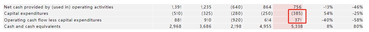 不仅如此,稳健的经营使特斯拉的“自我造血能力”进一步改善。可以注意到,本季度在资本开支持续增加的情况下,公司依然获得3.71亿美元的自由现金流,从而大大降低了资金链断裂的风险。