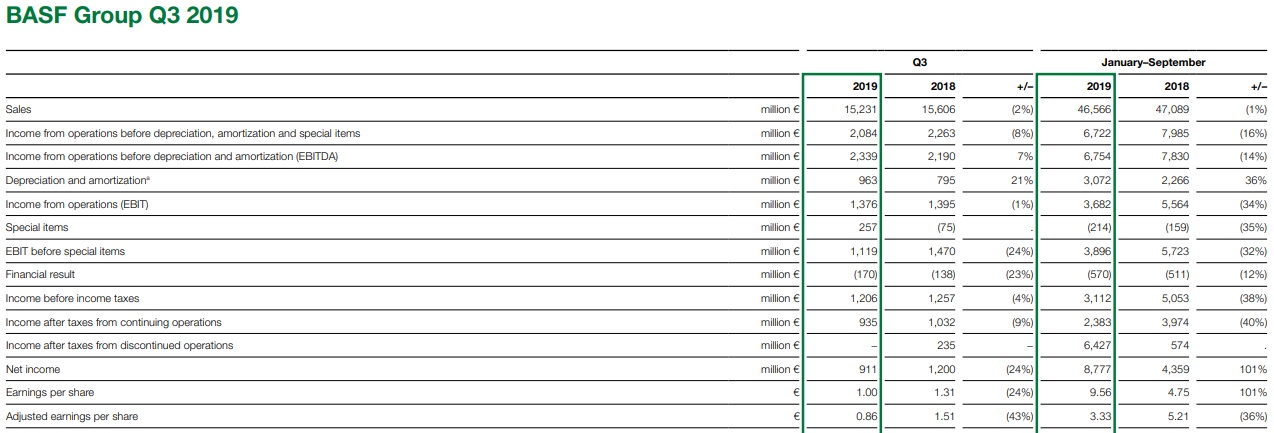 巴斯夫集团2019年第三季度的销售额同比下降2%,达到152亿欧元。执行董事会主席马丁·布鲁德穆勒博士(Dr. Martin Brudermüller)表示,这主要归因于材料和化学领域的价格下降。市场的不确定性和客户的谨慎订购也起到了作用。净收入为9.11亿欧元,同比下降24%。不计特殊项目的息税前收益(EBIT)为11亿欧元,同比降低24%。