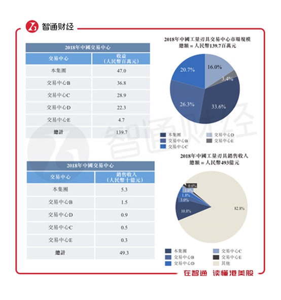 但就交易中心租金收益而言,公司2018年以4700万元排名第一,占市场总量的约33.6%;以交易中心内的租户销售总额算的话,公司2018年的53亿元同样排在第一,远远高于第二名的15亿元,占到总市场10.8%的比重;公司2018年底工具刃具种类数量达到12830种,比第二名的5076种多出一倍多,交易中心内品牌数量达到507个,也较大幅高于第二名的417个。