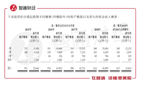 就收入端而言,公司一、二楼自2016年有过一次租金大幅上调,导致租金收入大幅上涨,带动总租金同比近乎翻倍外,2016年-2018年及2019年前四月的租金收入,几乎没有多大的变动。三楼租金也是在2016年推出,2017年调整过一次后,也没有再出现调整。