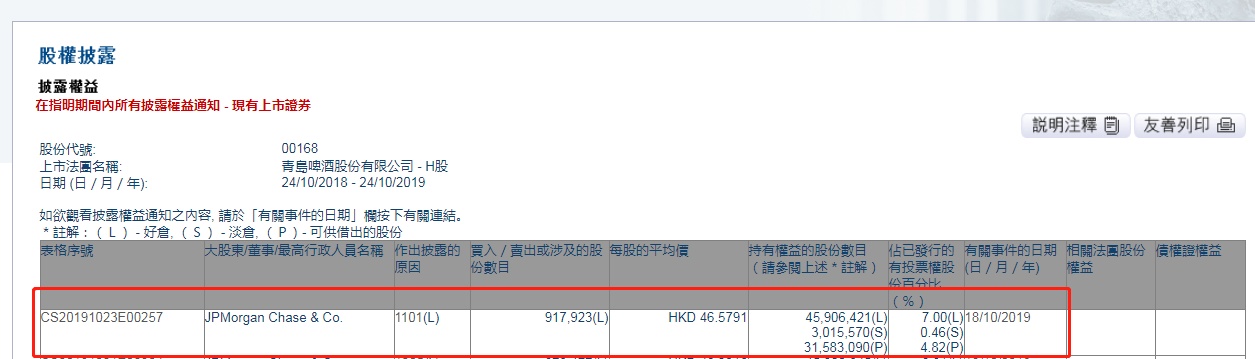 智通财经APP获悉,联交所最新资料显示,10月18日,摩根大通增持青岛啤酒(00168)91.79万股,每股作价46.5791港元,总金额约为4275.50万港元。增持后最新持股数目约为4591万股,最新持股比例为7.00%。