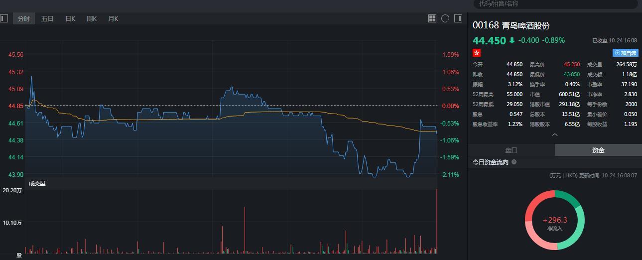 截至今日收盘,青岛啤酒跌0.89%,报44.45港元。