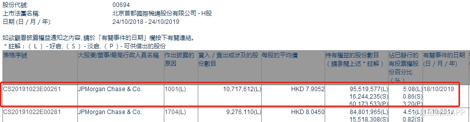 智通财经APP获悉,联交所最新资料显示,10月18日,摩根大通增持北京首都机场(00694)1071.76万股,每股作价7.9052港元,总金额约为8472.48万港元。增持后最新持股数目约为9551.96万股,最新持股比例为5.08%。