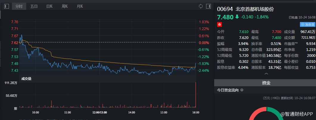 截至今日收盘,北京首都机场(00694)跌1.84%,报7.48港元。