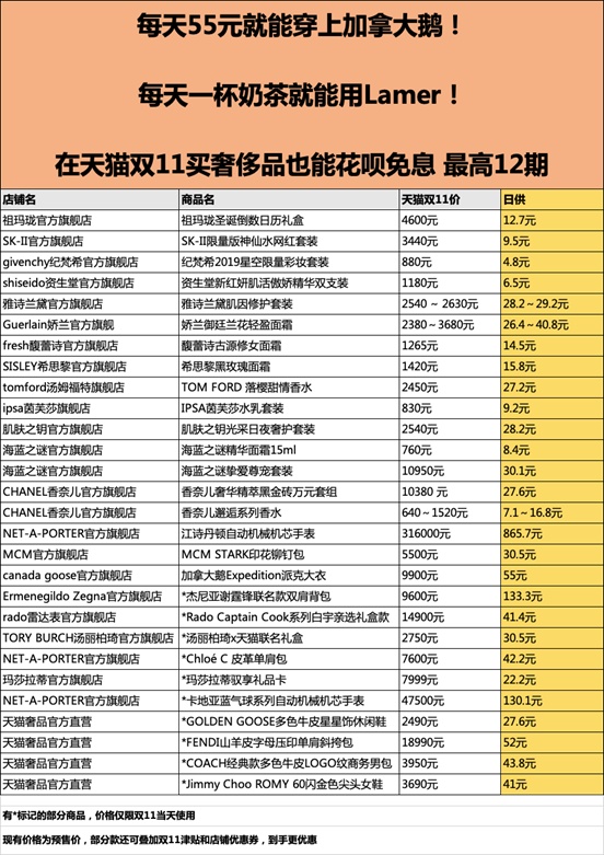 作为最省钱的一届天猫双11,也是全球奢侈品加入最多的一届天猫双11,全球93家奢侈品品牌宣布集体参加天猫双11。为了让中国消费者买得好、买得省,他们还首次面向消费者推出了6期或12期花呗分期免息!