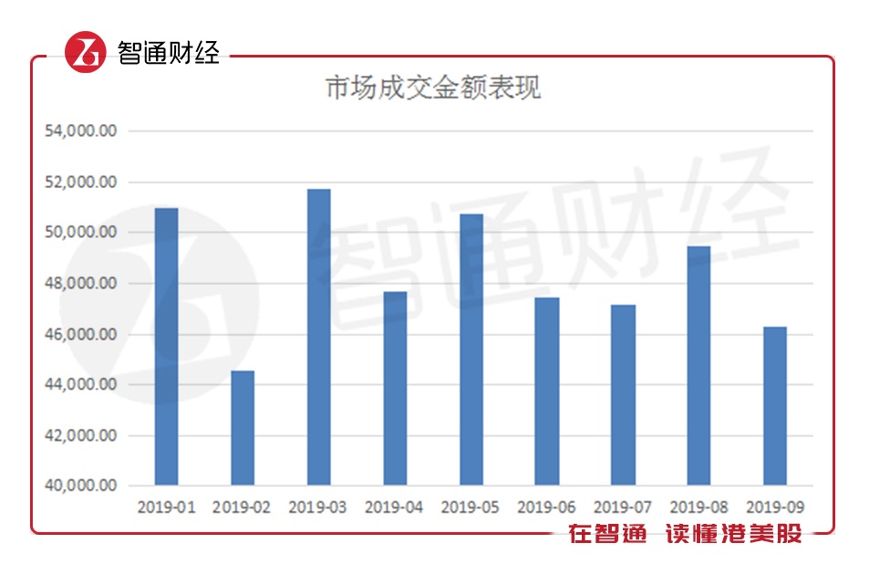 成交额方面,成交金额环比下滑的月份较多,2月、4月、6月、9月均出现下滑(NYSE、NASDAQ、AMEX三个市场合计)。其中,成交额于2月出现大幅下滑后,于3月份有所恢复。2019年三季度,三个市场整体成交额达14.29万亿美元,较去年同期下滑2.13%。