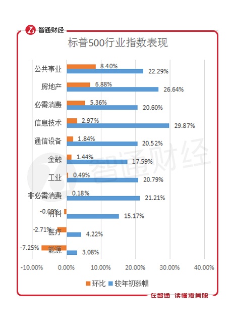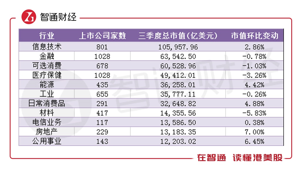 就目前美股的构成来看,上市公司家数最多的三个行业分别为金融、医疗保健、信息技术,所在行业上市公司家数约占总体上市公司数量的约49%,为构成美股最主要的三个行业。然而,三个行业在三季度的市值环比变动分别为-0.78%、-3.26%、2.86%。