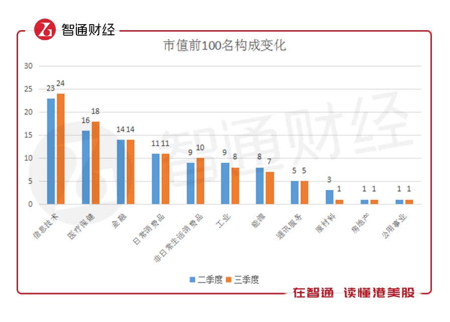 然而,若从三季度美股市值前100名行业分布来看,医疗保健行业依然累积了较多大市值公司,并且数量于三季度进一步增加2家。总体来看,科技行业依旧是美股聚集大市值公司最多的行业。