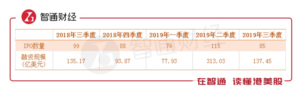 根据可统计数据,美国股市2019年第三季度IPO达85起,数量较去年同期及上一季度均有所下滑。截至前三季度,美国股市IPO数量共达276起。相比之下,融资规模较去年同期则有所上升,达137.45亿美元。