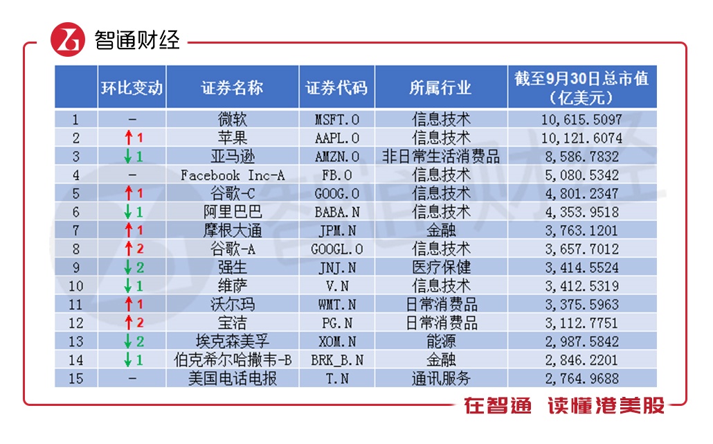 个股来看,美股市值排名前15席位整体较为稳定,未出现新进入者。其中,宝洁(PG.US)继上半年同比大幅上涨11名后,于三季度再次爬升了两个席位。微软(MSFT.US)则依旧维持了市值第一的地位,苹果(AAPL.US)环比上升一位。