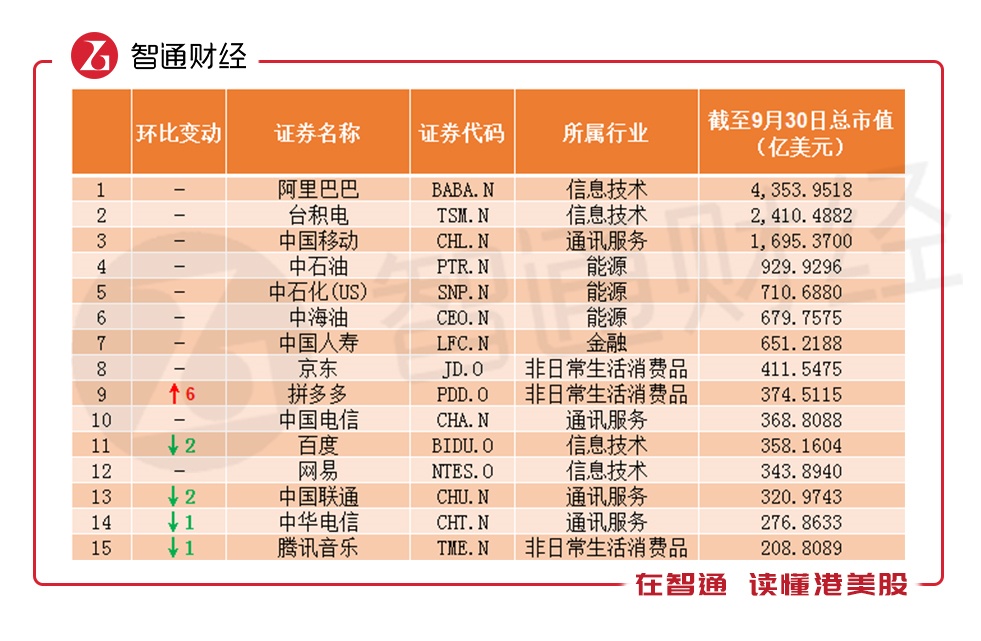 中概股市值排名前15的席位也保持稳定,尤其是前10名席位基本未出现变化。然而,拼多多(PDD.US)则成为三季度最大黑马,一举超过6家公司进入前10名,成为市值排名第9的中概股公司,排名紧逼京东。
