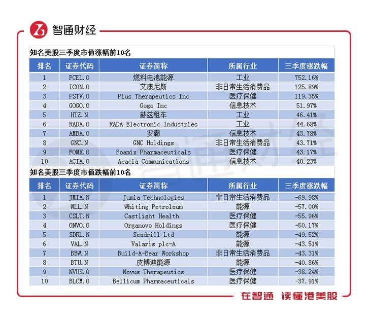 从市值表现来看,燃料电池能源(FCEL.US)为三季度市值上涨最快的公司。整体来看,信息技术、工业行业聚集了最多市值大幅上涨的公司。相比之下,三季度中市值下跌最多的公司多集中在医疗保健、能源行业。