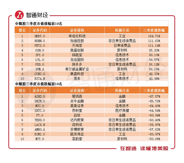 截至三季度,希伯伦科技(HEBT.US)、 如涵控股(RUHN.US)、天地荟(PETZ.US)为中概股中市值上涨最快的公司,涨幅均超过100%。在中概股市值涨幅前10名中,科技公司占比较大。
