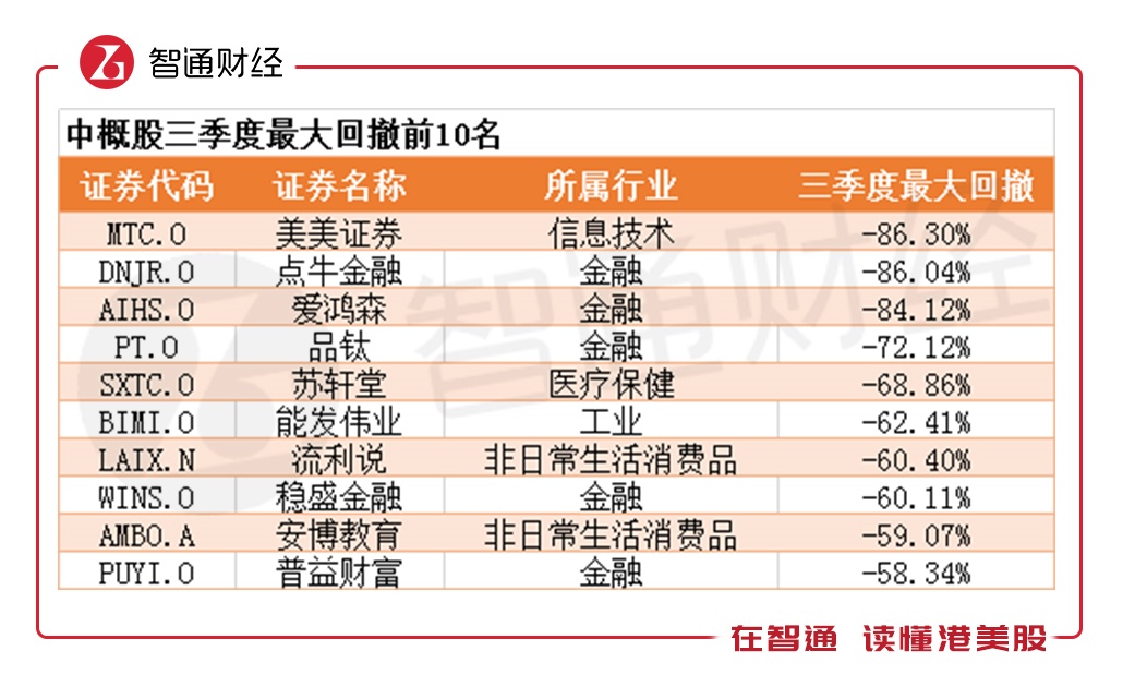 除此之外,在280只中概股中,共有8只标的于三季度单个季度中出现了60%以上的回撤。其中,美美证券(MTC.US)、点牛金融(DNJR.US)、爱鸿森(AIHS.US)、品钛(PT.US)、稳盛金融(WINS.US)无一不是金融类企业,其中多家公司均为互金企业。