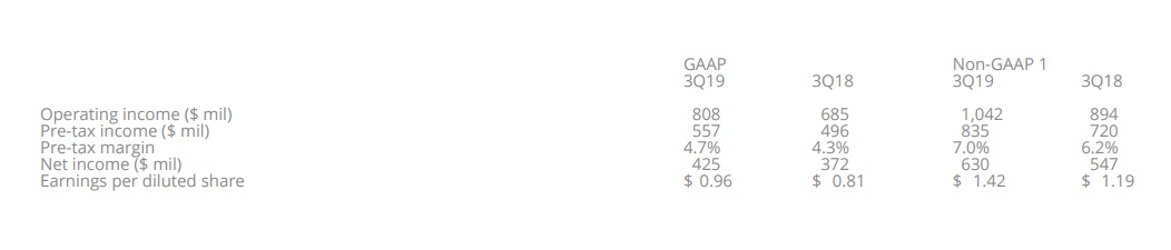 财报显示,2019年第三季度总收入为119亿美元,同比增长3%。非GAAP的税前利润(不包括特殊项目净额)为8.35亿美元,较2018年第三季度同比增长16%。不包括特殊项目净额,净利润为6.3亿美元,同比增长15%。或稀释后每股收益1.42美元,同比增长19%。三季度公司税前利润率为7%,去年同期为6.2%。
