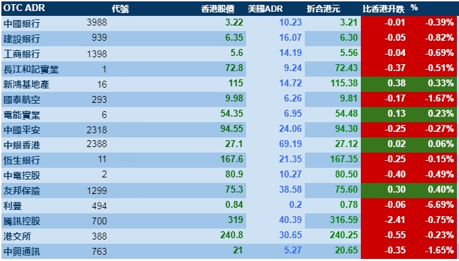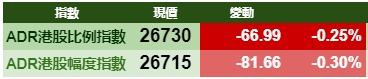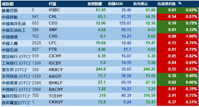 智通财经APP获悉,周四(10月24日)美股三大指数涨跌不一,港股ADR指数全日震荡向下,按比例计算,收报26730点,跌66.99点或0.25%。大型蓝筹涨跌不一,汇丰控股收报61.86元,较港收市涨0.01元;腾讯控股收报316.59元,较港收市跌2.41元。