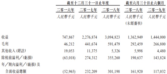 2016财年—2018财年及2019年六个月,公司的总收益分别约为人民币747.9百万元、人民币2,276.9百万元、人民币3,094.8百万元和人民币1,444.0百万元,而净利润则分别约为人民币-53.0百万元、人民币232.2百万元、人民币301.2百万元和人民币117.0百万元。