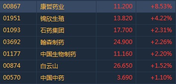 智通财经APP获悉,医药板块整体逆市走强,康哲药业(00867)快速上涨,创52周新高,领涨板块。截至10时21分,康哲药业涨8.53%,报价11.2港元,锦欣生殖(01951)涨4.22%,石药集团(01093)涨2.31%,翰森制药(03692)涨2.26%,中生制药(01177)涨2.2%。