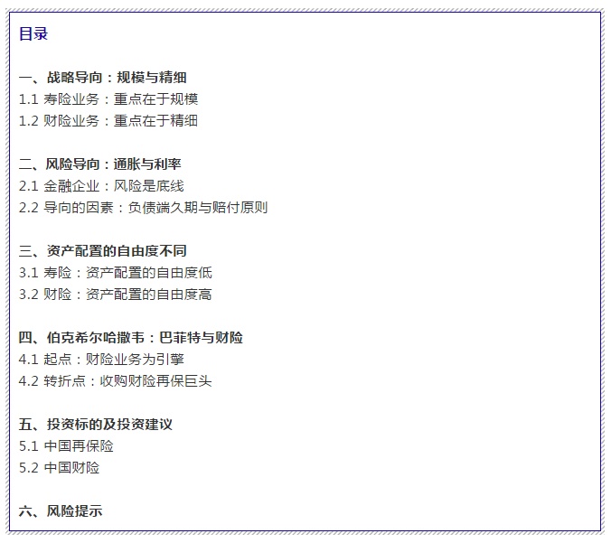 本篇报告是以财险为主题的深度报告。我们主要通过对比寿险业务来定位财险业务的经营特征以及投资价值。我们认为寿险企业与财险企业在资产配置自由度方面有着本质的不同,这主要因为两点:(1)战略导向不同;(2)风险导向不同。本报告旨在一般业务上的探讨,其中寿险业务指的是传统型的寿险业务,财险业务泛指的是保单有效期在一年左右的财产及意外险等业务。