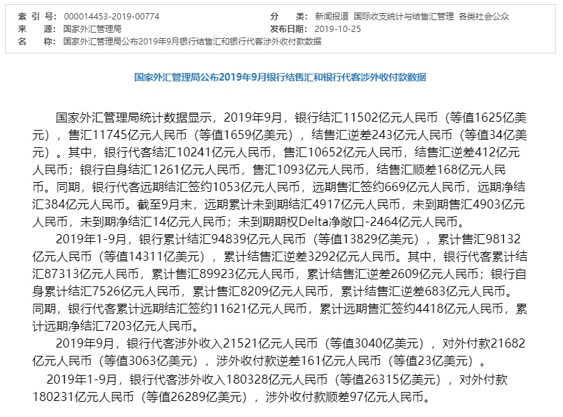 智通财经APP获悉,10月25日,国家外汇管理局公布2019年9月银行结售汇和银行代客涉外收付款数据。2019年9月,银行结汇11502亿元人民币(等值1625亿美元),售汇11745亿元人民币(等值1659亿美元),结售汇逆差243亿元人民币(等值34亿美元)。