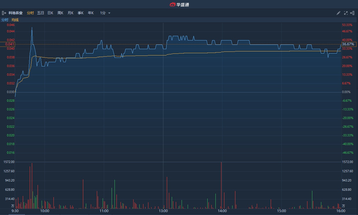 智通财经APP获悉,截止10月25日收盘,科地农业(08153)收涨36.67%,收盘价为0.041港元,盘中最高涨幅达0.045港元元;成交约3.2亿股,总成交额为1258万元。