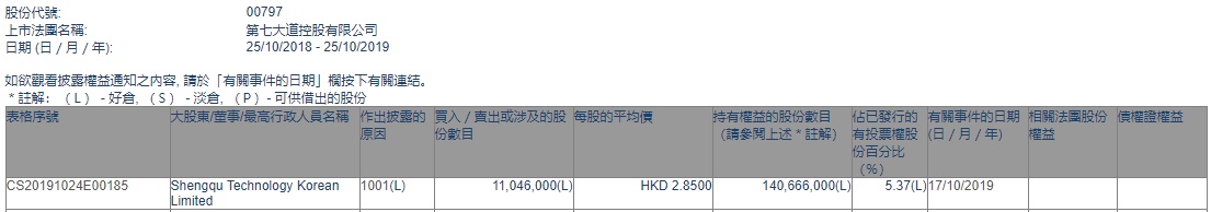 智通财经APP获悉,根据联交所资料显示,Shengqu Technology Korean Limited于10月17日增持第七大道(00797)1104.6万股,每股作价2.85港元,总值约3148万港元。增持后持股数为约1.4亿股。持股比例约为5.37%。