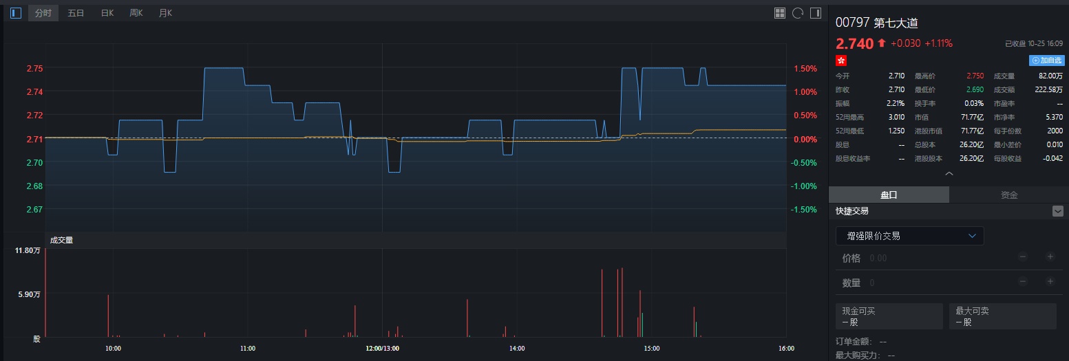 截止至今日收盘,第七大道涨1.11%,每股报价2.74港元。