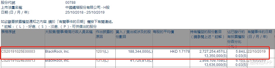 智通财经APP获悉,联交所最新资料显示,10月22日,贝莱德减持中国铁塔(00788)1.88亿股,每股作价1.7178港元,总金额约为3.23亿港元。减持后最新持股数目约为27.27亿股,最新持股比例为5.84%。
