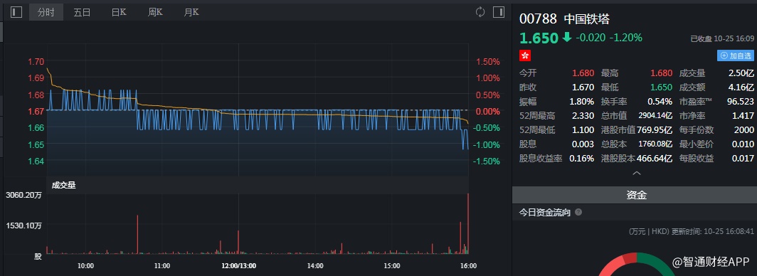 截至今日收盘,中国铁塔(00788)跌1.20%,报1.65港元。