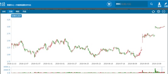 受此消息刺激,华能新能源于10月4日再度跳涨11.61%至2.98港元,当日成交量、成交额进一步提升至2.88亿股、8.57亿港元。截止10月25日收盘,公司股价平稳运行在3港元的平台,较8月启动时期已经超过50%的涨幅。要知道的是,2019年上半年底的拥有风电装机1116万千瓦,光伏装机93万千瓦,公司收入同比增长13%至71.4亿元人民币,同比增长31.7%至净利润30.9亿元人民币,但是大涨后的市值仅317亿港元,市净率为0.93,动态市盈率也只在7倍左右。