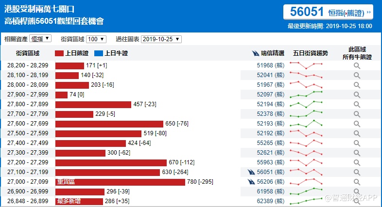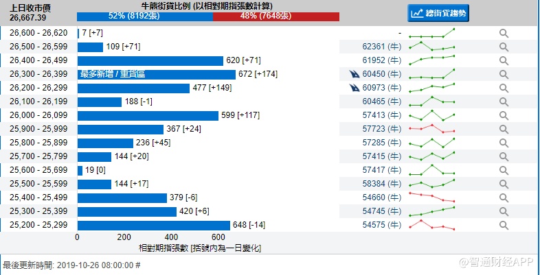 智通财经APP获悉,截至10月26日,恒指最新的牛熊街货比例52:48。瑞信恒指牛熊证街货分布图中的数据显示,熊证街货重货区和最多新增区都在27000-27099区间,该区间最新熊证数量为780张,较上一交易日减少295张;最多新增区间在26848-26899。牛证街货重货区在26300-26399区间,该区间最新牛证数量为672张,比上一交易日增加174张;最多新增也在该区间。