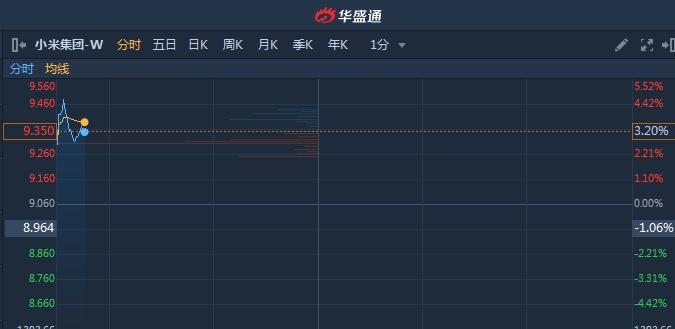智通财经APP获悉,小米集团-W(01810)获纳入港股通名单,早盘放量上涨,港股通成买盘主力,一度涨超4%。截至9时38分,涨3.09%,报价9.34港元,成交额5.677亿。