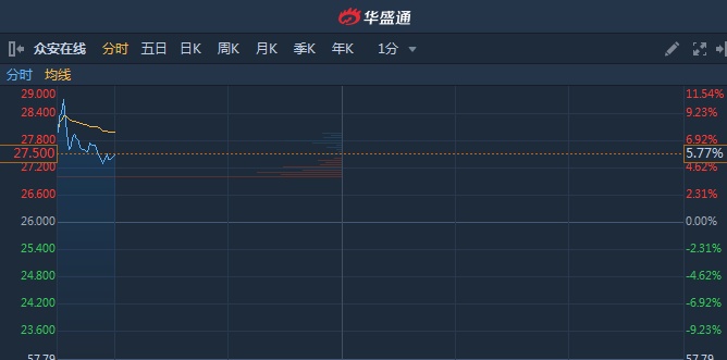 智通财经APP获悉,区块链概念获市场追捧,众安在线(06060)早盘曾一度涨超10%,创近半年新高,截至9时59分,涨5.77%,报价27.5港元,成交额1.185亿。