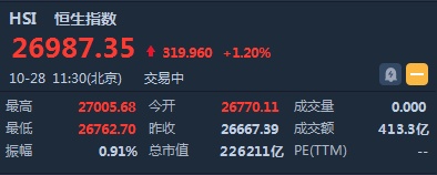 智通财经APP获悉,恒生指数今日高开高走,逼近两万七千点关口,汽车股领涨大市。截至11时30分,恒指涨1.2%,报26987.35点,成交额暂为413.3亿。
