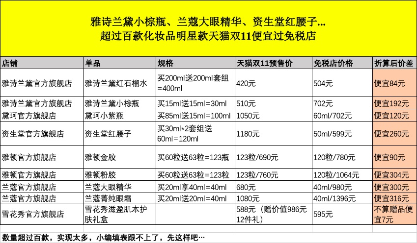 例如,雅顿粉胶天猫双11预售买60粒送63粒,折算下来760可以买到123粒,而在日上免税店60粒的价格为532元,天猫整整便宜了304元;兰蔻的大眼精华买20ml享40ml,只售680元,比免税店整整便宜300元;雅诗兰黛的小棕瓶15ml装眼霜在天猫双11买15ml赠15ml,预售价仍然保持在510元,在日上免税店同样的款要售702元。